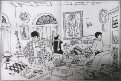 5. La persona più giovane nell’immagine è il ragazzo sulla destra. Sta gdando dei libri. Ma se osservate la scamicia, noterete che da un lato ha una manica lunga e dall’altro una manica a tre qti.