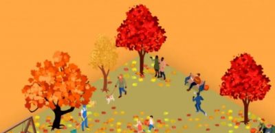 L’immagine mostra un parco giochi autunnale dove persone e bambini passeggiano. Tutti sono impegnati a fare le loro cose, ma accanto ad alcuni di loro ci sono le zucche che stiamo cercando.