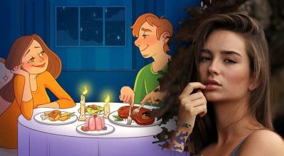Nell’immagine vediamo una cena romantica di una coppia di innamorati. Il ragazzo e la ragazza siedono a tavola e si gdano con ammirazione.